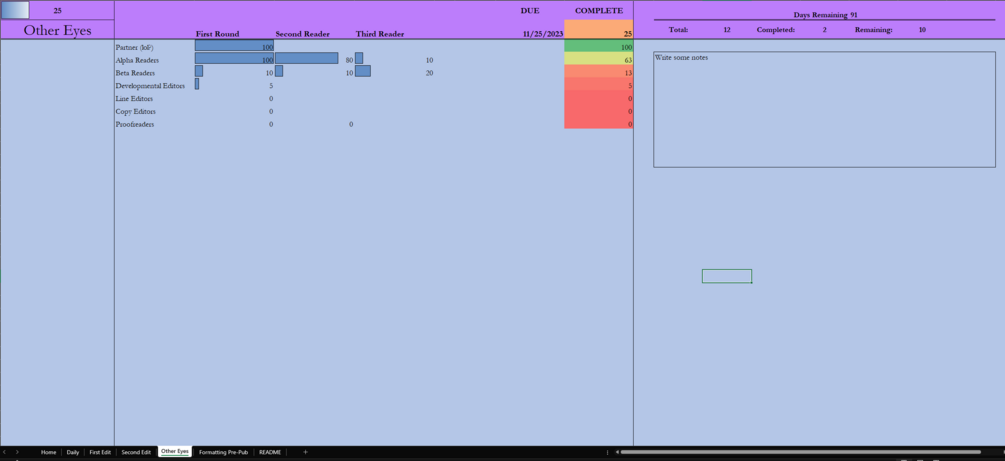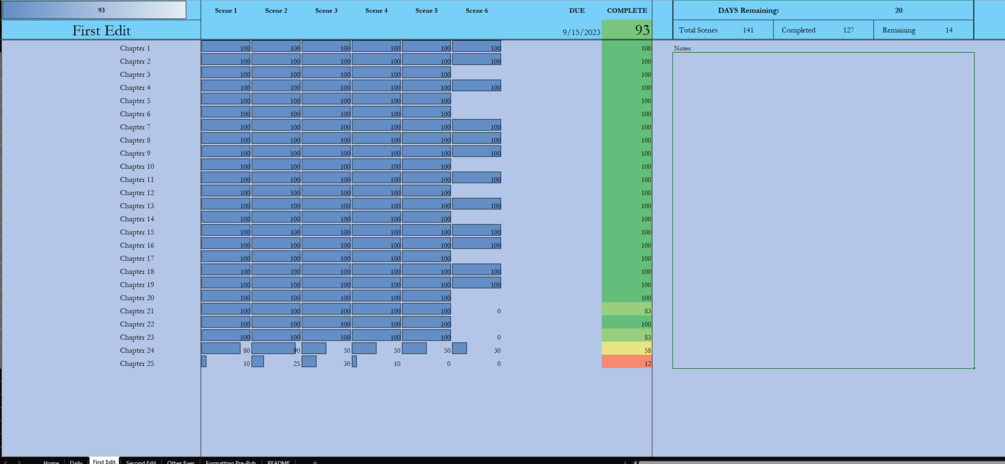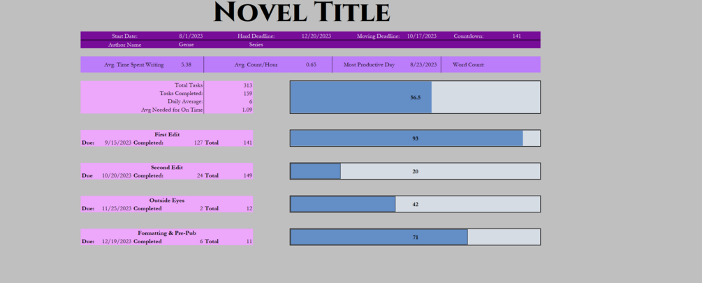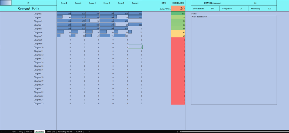 Easily track the entire process of editing your book! At a glance, see what chapters still need work, where you are in the process of reviewing beta reader feedback, track how many hours you write per day and find your most productive days, get forecasts on projected deadline if you continue to proceed at your current rate. Easily add in your own pages, detailed instructions on how to customize it and still have all the formulas work the way they should without you needed to touch anything!